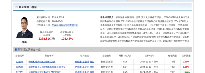 简历显示,柳军先生:中国国籍。监事,复旦大学财务管理硕士,2000-2001年任上海汽车集团财务有限公司财务,2001-2004年任华安基金管理有限公司高级基金核算员,2004年7月加入华泰柏瑞基金管理有限公司,历任基金事务部总监、上证红利ETF基金经理助理。2009年6月起任上证红利交易型开放式指数证券投资基金的基金经理。2010年10月起担任指数投资部副总监。2011年1月至2020年2月任华泰柏瑞上证中小盘ETF基金、华泰柏瑞上证中小盘ETF联接基金基金经理。2012年5月起任华泰柏瑞沪深300交易型开放式指数证券投资基金、华泰柏瑞沪深300交易型开放式指数证券投资基金联接基金的基金经理。2015年2月起任指数投资部总监。2015年5月至2025年1月任华泰柏瑞中证500交易型开放式指数证券投资基金及华泰柏瑞中证500交易型开放式指数证券投资基金联接基金的基金经理。2018年3月至2018年11月任华泰柏瑞锦利灵活配置混合型证券投资基金和华泰柏瑞裕利灵活配置混合型证券投资基金的基金经理。2018年3月至2018年10月任华泰柏瑞泰利灵活配置混合型证券投资基金的基金经理。2018年4月起任华泰柏瑞MSCI中国A股国际通交易型开放式指数证券投资基金的基金经理。2018年10月起任华泰柏瑞MSCI中国A股国际通交易型开放式指数证券投资基金联接基金的基金经理。2018年12月起任华泰柏瑞中证红利低波动交易型开放式指数证券投资基金的基金经理。2019年7月起任华泰柏瑞中证红利低波动交易型开放式指数证券投资基金联接基金的基金经理。2019年9月至2021年4月任华泰柏瑞中证科技100交易型开放式指数证券投资基金的基金经理。2020年2月至2021年4月任华泰柏瑞中证科技100交易型开放式指数证券投资基金联接基金的基金经理。2020年9月起任华泰柏瑞上证科创板50成份交易型开放式指数证券投资基金的基金经理。2021年3月起任华泰柏瑞上证科创板50成份交易型开放式指数证券投资基金联接基金的基金经理。2021年5月起任华泰柏瑞南方东英恒生科技指数交易型开放式指数证券投资基金(QDII)的基金经理。2021年7月至2023年8月任华泰柏瑞中证沪港深创新药产业交易型开放式指数证券投资基金的基金经理。2021年8月至2023年12月06日任华泰柏瑞中证全指医疗保健设备与服务交易型开放式指数证券投资基金的基金经理。2021年12月起任华泰柏瑞中证500增强策略交易型开放式指数证券投资基金的基金经理。2022年8月起任华泰柏瑞南方东英恒生科技指数交易型开放式指数证券投资基金联接基金(QDII)的基金经理。2022年11月起任华泰柏瑞中证韩交所中韩半导体交易型开放式指数证券投资基金、华泰柏瑞中证1000增强策略交易型开放式指数证券投资基金的基金经理。2023年3月起任华泰柏瑞纳斯达克100交易型开放式指数证券投资基金(QDII)的基金经理。2023年9月起任华泰柏瑞中证2000交易型开放式指数证券投资基金的基金经理。现任华泰柏瑞基金管理有限公司副总经理。2023年10月起任华泰柏瑞中证A股交易型开放式指数证券投资基金的基金经理。